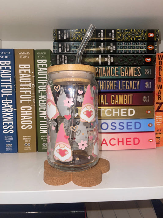 Valentine Gnome Libbey Glass Cup – Cute Iced Coffee Tumbler with Optional Straw, Lid & Coaster